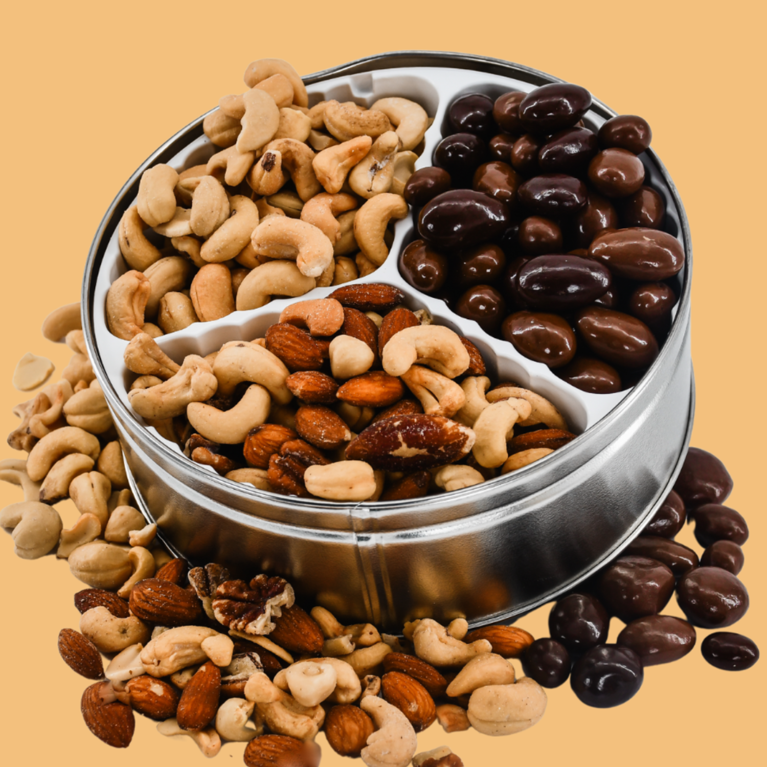 A trio that never disappoints! Roasted cashews, fancy deluxe mixed nuts, and chocolate-covered almonds. Hand roasted in-house for peak freshness, this tin delivers the perfect balance of sweet, salty, and nutty flavors. A crowd pleaser for any occasion.