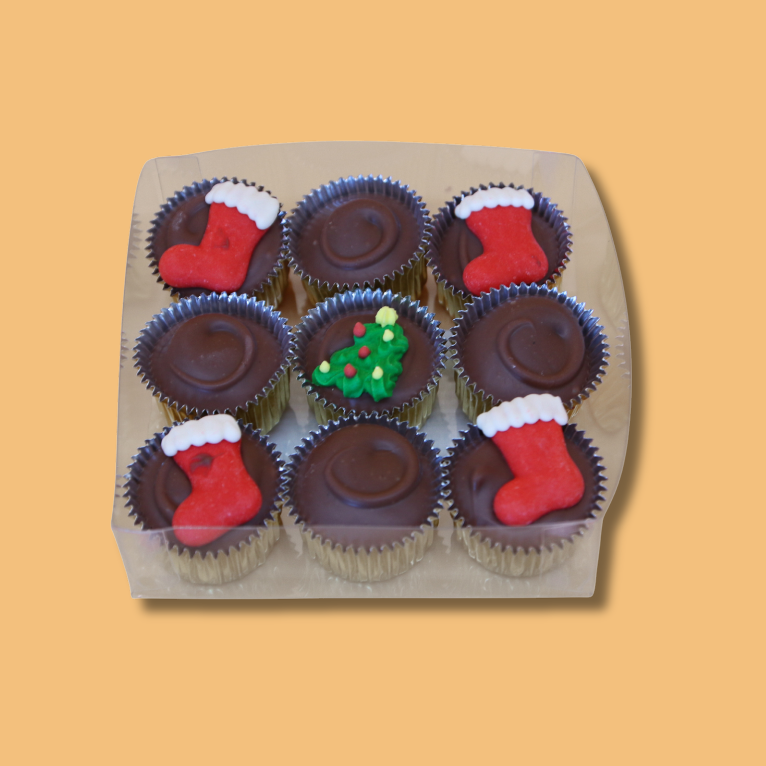 Celebrate the season with nine pieces of solid milk or dark chocolate, topped with a festive sugar decoration. A cheerful holiday treat that's as fun to look at as it is to enjoy!