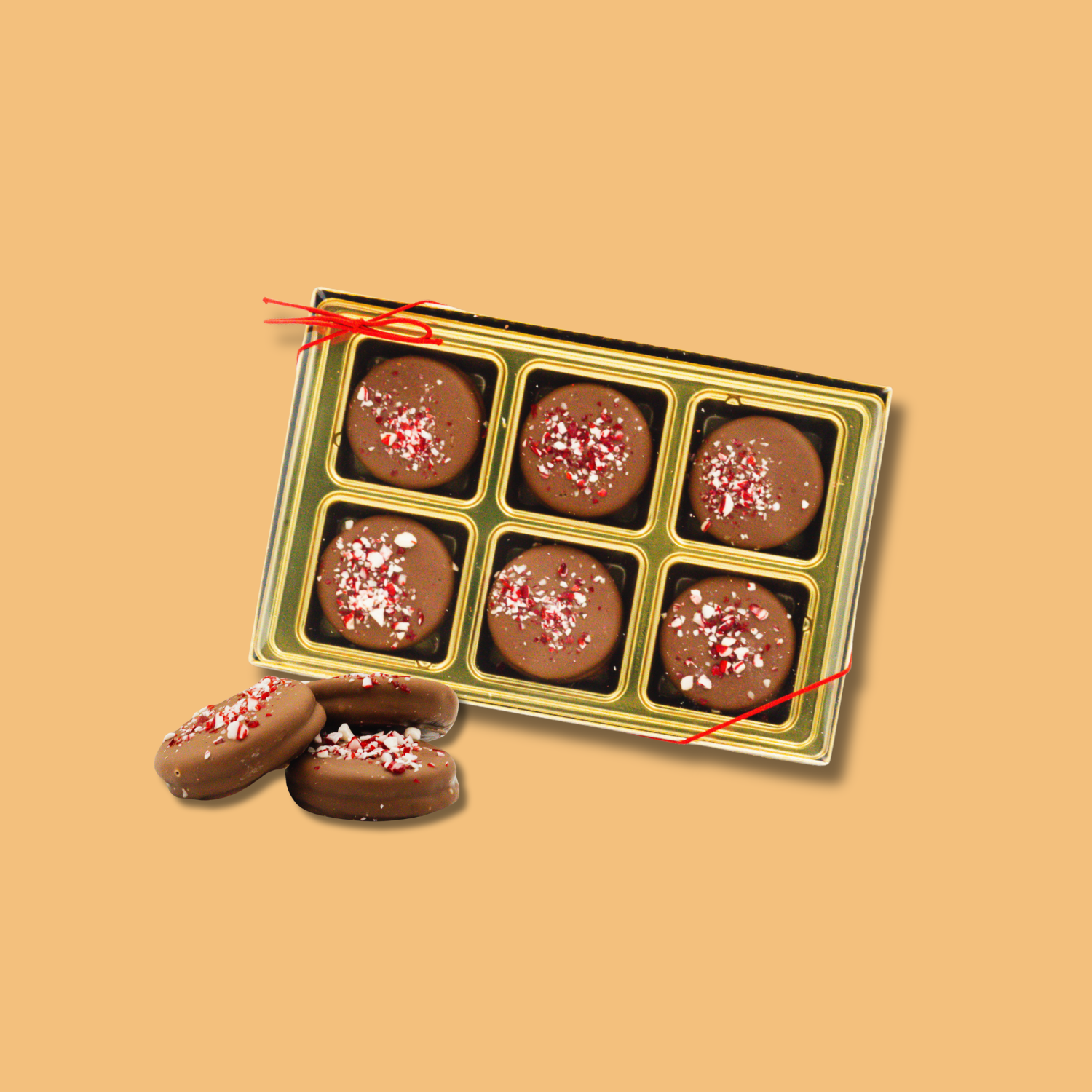A festive favorite! Six Oreos, enrobed in milk or dark chocolate and topped with crushed candy canes for the perfect holiday crunch. Packed in a gift-ready box this sweet treat is great to share or enjoy yourself!